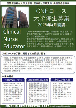 Clinical Nurse Educator(CNE)とは臨床に軸足を置く教育の専門家であり、エビデンスに基づいた看護をおこなう看護実践者です。看護学生や看護師など看護に関連するすべての人が対象であり、さまざまな学習理論や研究成果をもとに育成をおこないます。また、教育と自らの看護実践をとおして、常に看護ケアの質を改善もおこないます。近年、臨床現場にて教育の専門家としてCNEがわが国でも必要とされています。